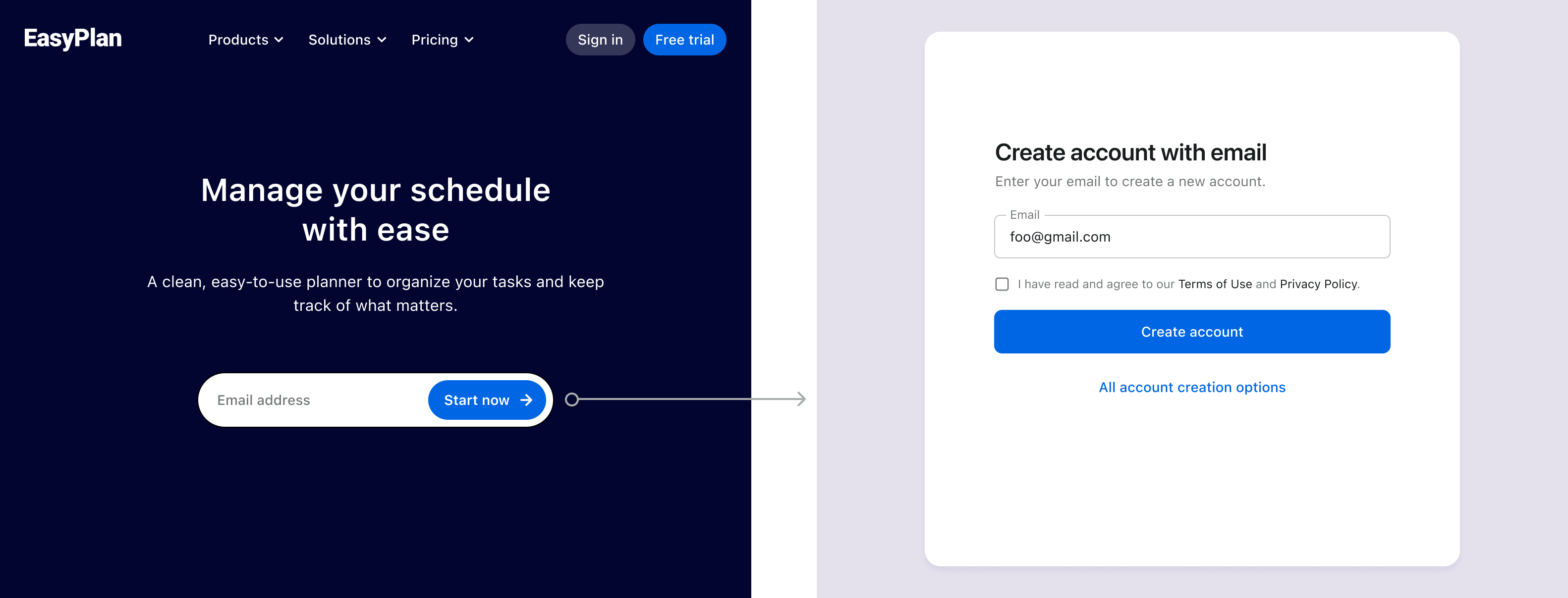 • When users enter their email and click the sign-up button, use the first screen parameter to redirect them to the sign-up page with the email pre-populated.